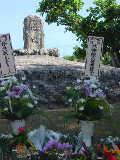 | 【第7日目−2】 ● 魂魄 平和祈念公園から少し戻り、米須の部落を過ぎたひめゆりの塔の手前の路地を左手に曲がります。一帯は、さとうきび畑が広がる南部らしい風景です。ゆるやかな坂を下って行くとこんもりと木が茂った一画に出ます。慰霊の日である今日は、回りにひっきりなしに人々が集ってきます。広場の少し入った所に石を積んだ、丸い小山とその上に魂魄と書いた石の碑がのせてある慰霊塔があります。これが、「魂魄の塔」です。この一帯は、まさに最後のどん詰まりで、しかも平坦な土地ゆえ、これと言って身を隠すところもなく、米軍の砲火によって多くの住民犠牲者を出した場所です。戦後、米軍の命令で住む場所をここ米須原に移動させられた真和志村民は、食料確保の農作業をするためには、周囲に散乱する遺骨の収集から始めなくてはいけませんでした。地元の人たちと真和志村村民たちは、米軍にかけ合い許可得、この地に1946年2月27日、納骨所を完成し、「魂魄の塔」と命名しました。塔には、この地の周辺で戦争の犠牲となった3万5千柱の遺骨が納められていました。沖縄最大でかつ最初の慰霊塔であると言えると思います。多くの住民の犠牲者は、行方不明のまま亡くなっています。そうした方々の遺族にとっては、この塔が唯一の慰霊の地になっているわけで、公の慰霊祭が摩文仁に移ってしまった今でも、沖縄県民にとっての魂の故郷は、ここであると思います。 ● 非戦の心 ● 2002年夏でした。 |