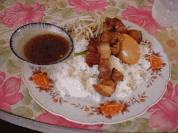 昼の飯時は、どのコムも大繁盛です。まあ、 厳密に言えば、地元の人に人気のあるとこ ろ、つまりおいしいところと今いち、人気 がないところはありますが、ともかく、歩 道いっぱいまで、なぜか風呂で使うような プラスティックの小さないすにテーブルを 出し、みんな、かっこよく言えば、オープ ンカフェのような状況で飯を食っているの です。例えば、定食屋の場合のシステムを 説明しますと、店の入り口にショウウィン ドウのようなガラスのケースがあります。 その前に立って、かたわらで待ち構えてい る、お兄さんかお姉さんに、ケースの中に あるおかずを指ししめします。