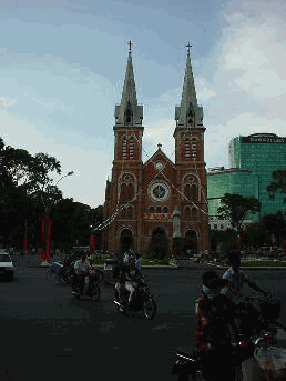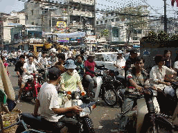 私たちが、ホーチミン市に足を踏み入れて 最初に驚くことは、オートバイの多さです。 今、ベトナムでは、その庶民の足として、 オートバイがその主たる地位を築いていま す。街の道路という道路は、数百台、いや、 数千台のオートバイによって、埋めつくさ れていると言っても過言ではないと思いま す。ベトナムにおいて、オートバイの一般 的な呼称は、「ホンダ」です。 まだ、信号機などの整備が遅れているホー チミン市において、こんな状況の道路を横 断するのは命がけです。私たちの感覚では、 一気に走って横断をしたいところですが、 それは逆に危険です。運転手がとっさには よけれないからです。したがって、何百台 もオートバイが走ってくる中を、遠くから 運転手に認識させるため、あえて、ゆっく りとわたらなければいけません。これは、 かなり勇気がいる行動です。まさに郷に従 えの手本のような話しです。 おっと、また、こんな時間に明日のベトナ ム語の予習をせねば、今日はこのへんで。 KAN