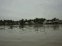角を曲がった。椰子の葉っぱで四角く囲っ たものが見えました。親父がしゃがんでい ました。目と目が合いました。親父がにゃ っと笑った。思わず、「シン・チャオ」と 言ってしまいました。そこは露天便所だっ たのです。あわてて視線をそらし、さらに 先へと進みました。 すると今度は、人の顔をした、太郎左右衛 門のような犬が、まとわりついてきました。 でも、ベトナム語でほえてくるから私には 彼らの言っていることが理解できませんで した。かろうじてわかったことは、ここは 俺様の場所だ勝手に入るなと言うことでし た。犬たちがいた場所の直ぐ際を小川が流 れていました。そこには、アヒルのような にわとりような鳥が行水をしていました。 さらに進むと墓場が現れました。どうやら、 土葬のようです。はかばかしくないので、 小走りに墓場を抜けました。するとそこか らは、ジャングルでした。
