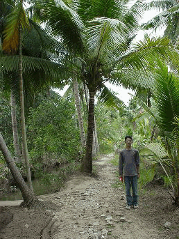 家もまばらになりました。細いジャングル の中の一本道をテクテクと歩きます。椰子 の木の間からこぼれてくる南国の太陽光線 は、私の体を射抜くように鋭く、体中の汗 腺と言う汗腺から一気に汗が噴出してきま す。ジャングルの林の向こうからは、キキ キキキキと言う、鳥たちの叫び声が聞こえ てきます。完全に迷ったようです。市街か らたかが数十分のところでである。プラト ーンのワンシーンを彷彿します。少し小走 りに走ってみました。ジャングルを走るチ ャーリーシーンかはたまた、それを追いか ける解放戦線か。ともかく、ハードワーク であることに違いはありません。 また、犬にほえられました。 家がありました。ジャングルの中に忽然と 現れた家です。玄関先で意を決して声をか けてみます。「シン・ローイ!!」怪訝そ うな顔をしたお婆が、私たちを出迎えまし た。「シン・ロイ」「トイ・ムオン・ディ ー・ヅングフォー」すると、お婆は、どう もこんなことを言っているようです。「あ ー、ダメダメ、私は外国語は一切、話せな いんだから」といいながら、私たちと片言 のベトナム語で話している。結局、近所の 人がみんな出てきました。中に英語が話せ るお嬢さんが登場。彼女の家は、このジャ ングルに忽然と現れた、鉄筋コンクリート 2階建ての高級住宅、英語を話せるという ことは、英語圏の国でかせいできたのか? ともかく、街まで戻る道を教えてもらい。 ジャングルの小道を街に戻ったのでした。 となりの家の路地をまがったり、墓場を越 えたら、そこは別世界だったのです。 あー長くなってしまった。 続きはまた明日。 ではまた。 KAN