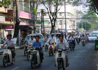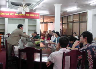 朝のラッシュアワーの中をかきわけて車は進み、大学に 到着すると昨年もお世話になりましたハイ先生をはじめ 他の先生方も待っていてくれました。ここでも私たちの ことを覚えてくれていまして、今年もよく来てくれまし たと、ニコやかに授業ははじまりました。ニコやかな顔 とは別にきびしーい授業が、今年も。 初日の担当の先生は、大阪外国語大学でもベトナム語を 教えたことのある学長のホン先生でした。笑顔できびし い授業は、私たちの集中力を途切れさせませんでした。 久しぶりの脳の活性化は、おおいに細胞を生み出しまし た。今日の内容は、挨拶と数と買い物の会話でした。 ベトナム語の難しいところは、中国語などにもある声調 です。微妙な音の変化を表現するのは、なかなかたいへ んです。似たような音も発声がまったく違かったりして、 何度、先生に繰り返されたことでしょうか。もっと継続 的にやらねばとその時ばかりは思うのでした。