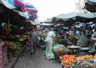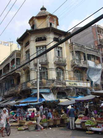 中華街と言っても日本のような感じではなく、むしろ、 もっと大きく、中華系の人たちが暮らす街という感じで す。 歩いて行くには、少々遠いので、タクシーを利用しまし た。さっそく語学研修が生きます。「チョー・トイ・デ ン・チョーロン」が、そうは簡単には通じません。声調 が正しくないのです。チョーロンなのか、チョロンなの か、チョローンなのか、私たちにとっては、その変わり はなかなかわからないのですが、声調が違うとまったく 通じないのです。何パターンか話すうちにどうにか通じ て、チョロンへと向かいました。 元はと言えば、メコンデルタで取れる、米の売買などを 商売の中心にするために中国から来た華僑たちがそのま ま住みつき一つの街を形成しました。 たくさんの専門店が並ぶ、まさに喧噪の町です。中でも その中心にあるビンタイ市場の周辺は、どんちゃん騒ぎ のような感じです。ベトナムをはじめとする、おそらく 周辺の国の商人たちも交じっていると思います。そんな 買い付けの風のオヤジさんたちや日常の台所を仕切るお あばちゃんたちが、あちらこちらの露天のお店の前で、 商談に花を開かせています。 金物屋、生地屋、お菓子屋、魚屋、肉屋、乾物屋、靴屋、 鞄屋、薬屋、文具屋、漢方薬屋、八百屋などなどとあり とあらゆるお店が集まり、町全体が、スパーマーケット というか百貨店のようになっています。その迷路のよう な店と店の間の路地を歩くと何か別の星に降り立ったよ うに思えてきます。