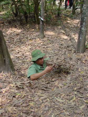 【旅日記】 2日間のベトナム会話の集中講義もどうやら終わり、3 日めは、ここホーチミンから約北西へ約70kmほど行 ったところにあるクチという街へ行きました。 サイゴン河沿いにあるこの街というか、この地域は、ベ トナム戦争時、鉄の3角地帯と言われ、難攻不落の南ベ トナム解放民族戦線の拠点があった所です。そんな拠点 がなぜ、有名なのかと言いますと、当時、アメリカの傀 儡政府であったサイゴン政府の軍隊とそれを支援をする アメリカ軍は、アメリカ軍の伝統的な攻撃パターンであ る物量作戦で解放戦線側を一掃しようとします。陸から は、戦車や火炎放射器、空からB52の空爆、そして枯 れ葉剤などとありとあらゆる近代兵器を使い攻撃をしま した。 それに対して、一般の市民や農民たちが中心であった解 放戦線部隊は、徹底したゲリラ作戦で対抗したのです。 サイゴン政府のあるサイゴンまでは、河づたいでいけば、 近い位置にあったこの地域は、戦略的にも重要な場所で した。 昼間は、アメリカ軍やサイゴン軍が、その機械力に言わ せて傍若無人に暴れ回り、荒れ野原となったこの場所で も地元のゲリラたちは、夜になると地下に掘って待避を していたトンネルから這い出てきて、食料用に畑をつく ったり、敵に夜襲をかけたりしていました。
