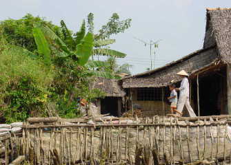 景へと変わっていた。南部の背骨である国道1号線を車 ひた走る。ホーチミンに増して、日差しが強くなってく る。回りの木々は、ニッパヤシを中心とした南国特有の 林に変化をしている。昨年は、フェリーボートで渡った メコンの支流の一つに、立派な橋がかかっていた、オー ストリアとの合弁で作った橋は、まさにメコンのベイブ リッチの様相を呈していた。橋の最上部から見るメコン デルタ一帯の景色は、地平線の彼方までジャングルがつ づく緑の絨毯を引き詰めた場所だった。 さらに進んだもう、河口まで、そう遠くない街、ビンロ ンにつく、昼御飯を食べた後、そこからは、小船に乗り 換えて、さらなる奥地をめざす。小さな運河に入り込ん だ。両岸の岸辺には、小さな家が立ち並ぶ、小径を子ど もたちが、歓声をあげて走りさる。川岸では、女たちが 髪をすき、食事の支度をする。デルタの中にある小さな 中州に船はついた。