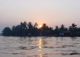 【旅日記】 カントー(カントーと語尾が下がるとベトナムの人には 通じない。カントー↑とちょっと大げさなくらい上げる と、おおー、カントーねってわかる。やはり、声調は難 しい)の朝は早い。もう既に、薄暗いうちから、街中の 人が活動をはじめている。露天の屋台は、朝飯をスタン バっているし、ホテルの前の川岸公園では、バトミント ン、セパタクローみたいの、太極拳みたいな運動の同好 の士たちが、朝練にぬかりはない。個人では、目の前の カントー河で、朝の一泳ぎをする者もいる。 カントー河が朝焼けに染まる頃、私たちも河の上流で行 われている水上マーケット、ようは水上市場の見学に出 かけた。スパルタンな音を響かせながら、私たちを乗せ た船は、上流を目指した。向こうの島や支流からは、学 生や物売りのおばちゃんたちを乗せた小さい船が、カン トーの中心部を目指して、押し寄せてきていた。
