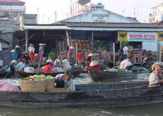 【旅日記】 ビンロンの沖というか、中州にあるアンビン島を後にし て、私たちはさらにメコンの中心部へと足を踏み入れま した。今日の泊まりは、ホーチミン市から車で約5時間 のところにある、カントー省の省都であるカントー市で す。人口約33万人のメコンデルタの中心都市は、メコ ンデルタの米が集まってくる場所としても有名です。 カントー河をフェリーで渡ると直ぐにカントーの中心街 に入ります。ホーチミンに比べれば、やはり、地方都市 なので、人やオートバイの往来は少な目ではあります。 しかし、その分、町には、落ち着きがあり、気持ち的に は、休まります。 カントー河の畔に建つホテルに宿をとり、さっそく、メ コンデルタで一番と言われているカントーの市場へと繰 り出してみました。一歩、足を踏み入れてみるとそこは、 まるで、アミューズメントパークのような場所でした。 ありとあらゆる食材が揃っています。果物、野菜、魚、 肉、乾物、お菓子、薄暗い路地の奥にもまだまだ、お店 が連なります。服屋、金物屋、生地屋、帽子屋、ラジオ 屋、まるで、何か巨大な生き物の腹の中の入ったような 底なし感です。