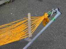 | ● サイズは、ラージサイズ(全長246cm、9.5kg)とスモールサイズ(全長227cm、9.0kg)があります。簡易スタンドの色はL、Sとも、シルバー(灰色)です。ハンモックは純正品ではないので、端を結んだりして調節が必要です。簡易スタンドにかけるための金具はこちらでつけます。実用的にはまったく問題ありません。 |